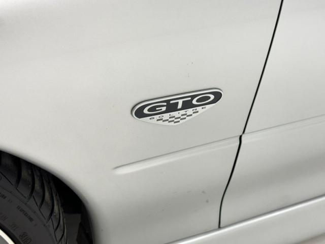 Fashioned from black curved molded vinyl and a strip of suede, the door panels are as aerodynamic as the exterior. High back extra bolster support buckets in black leather have an embroidered GTO in their uppers. These seats are power adjustable and in back is a 2 plus 2 bench setup stretching from B pillar to B pillar. In the center is a curved molded console that makes its way gracefully upward and melting into the dash. On its way is a Blaupunkt 6-disc AM/FM/CD radio, green screen readout for information and fan and temperature knobs. The dash borrows styling directly from Porsche with the overlapping red background circle gauges, and more green readouts, under a curved dash top visor. Black carpet for the floors and more molded panels covered with slightly fuzzy charcoal gray material for the headliner.