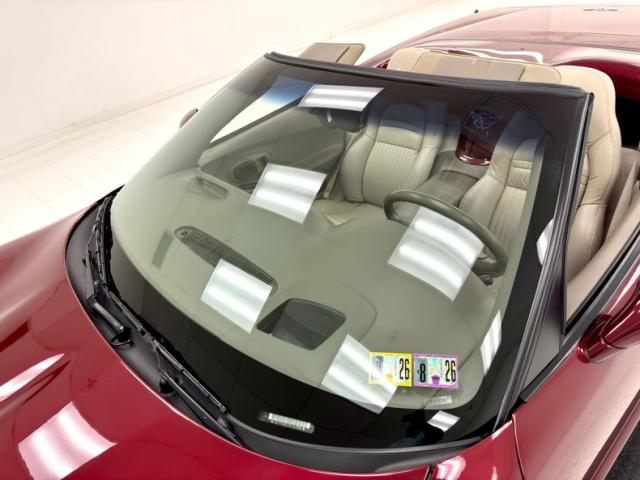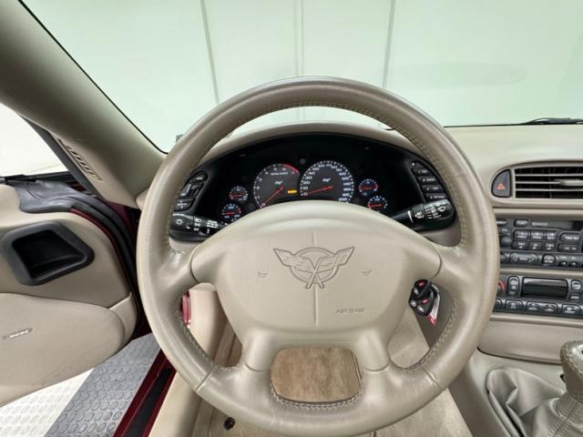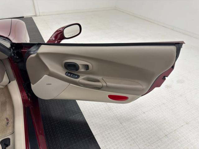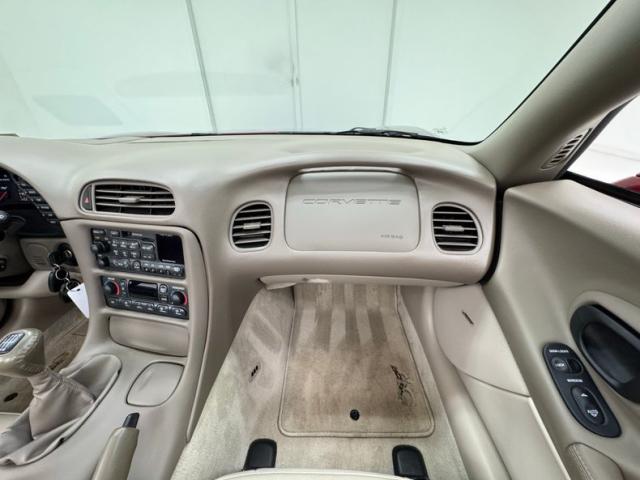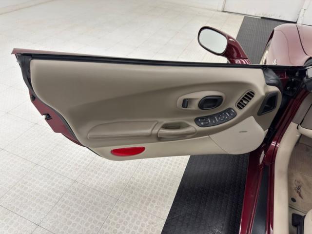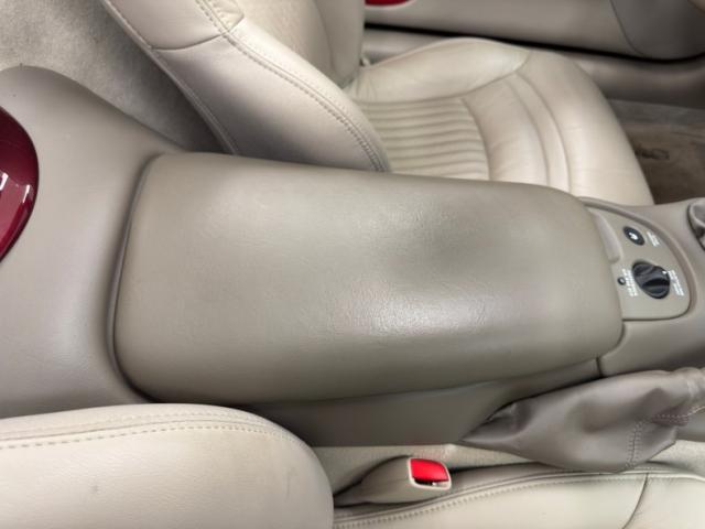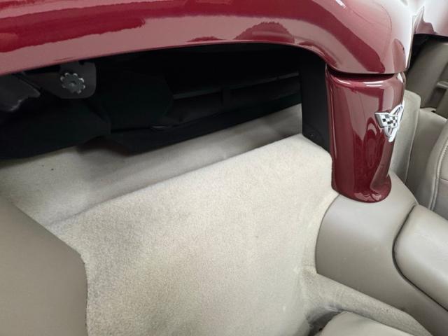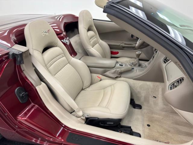 The Corvette cove with faux vent on the front quarter harkens back 50 years, and as the first Vettes were topless and special50th Anniversary Red drapes the exterior of this car. What\'s different from those days is the sharp wedge shape of the C5, a low nose leads upward to a rear deck lid that is considerably higher, giving the car a slightly raked appearance. The tan convertible canvas is in great condition here and contains a glass rear with a defog function, and the slight bronze hue to the five spoke wheels pick up on the soft top color nicely. Epic quad exhaust are center exit of course, while special badging adorns the nose and front quarter panels. There are no exterior flaws on this well preserved \'03. Let\'s take a look inside!