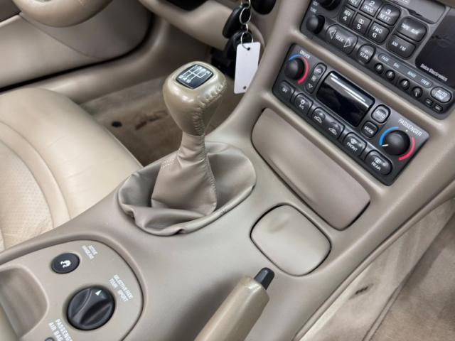 Shale leather, a shade of calming beige, power adjustable high back buckets embroidered with \"Corvette\" name and 50th anniversary crossed flags await you and they\'re in immaculate shape. Sliding in will put you into a cockpit with an AM/FM/CD sound system with Bose Speakers, dual zone electronic A/C, a driver\'s info center on the dash above the console, cruise control, and power locks and power windows. It\'s all in very good condition, obviously well cared for, right down to the tan shifter and center console. The beige carpet below, which is not easy to keep clean, presents as showroom fresh here as it covers the transmission hump and works its way to the modest package shelves behind the seats. Matching carpeted mats on the top are also excellent and wear the 50th anniversary embroidered emblem.