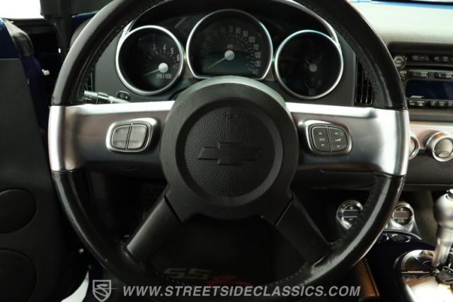 For 2005, the SSR got a big upgrade under that trick wedge-shaped hood. Gone is the 5.3-liter Vortec V-8 from earlier years, and in its place we find a Corvette-derived 6.0-liter LS2 V-8 engine. Thanks to a lightweight aluminum block and heads, flat-top pistons, and a healthy 10.9:1 compression ratio, this LS2 was capable of pumping out an impressive 390 horsepower and 405 pound-feet of torque when it rolled off the assembly line two decades ago. Those ponies are routed through a heavy-duty 4L60E four-speed automatic transmission before being sent out to the 3.73-geared Positraction rear end, which transmits power to the pavement via a set of big 20-inch polished five-spoke wheels shod in massive 295/40R-20 rubber. At the same time, a smaller set of 19-inch wheels wrapped in 255/45R-19 tires give this throwback pickup the perfect staggered hot rod stance.