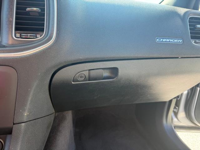 Finished in Billet Silver Metallic Clear Coat with contrasting black accents and aftermarket hood wrap, this Charger stands out with its aggressive styling. Exterior features include a body-color rear spoiler, 20-inch Granite Crystal aluminum wheels, HID projector headlamps, LED fog lamps, and Gloss Black grille for a sharp, performance-oriented look.