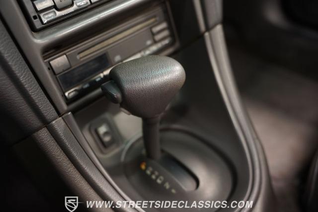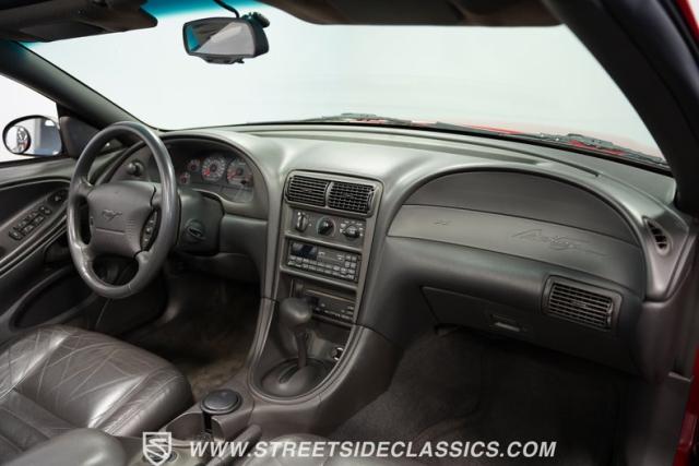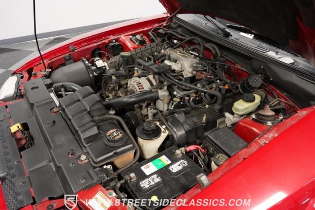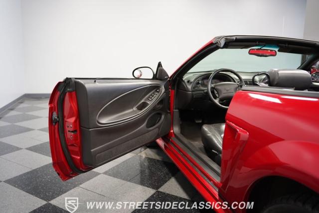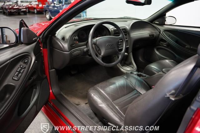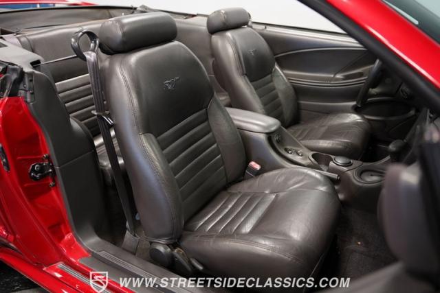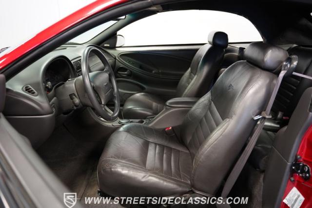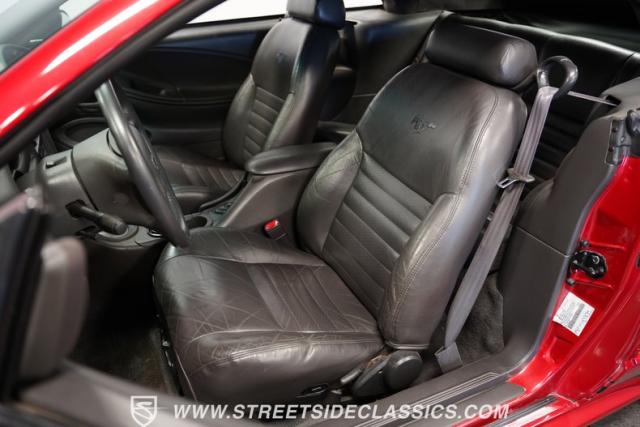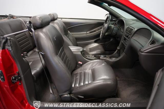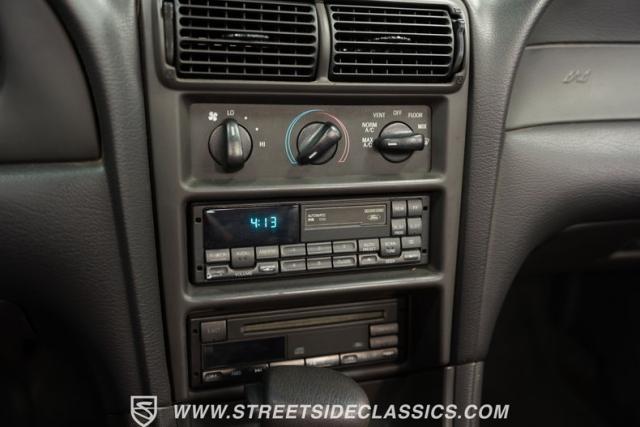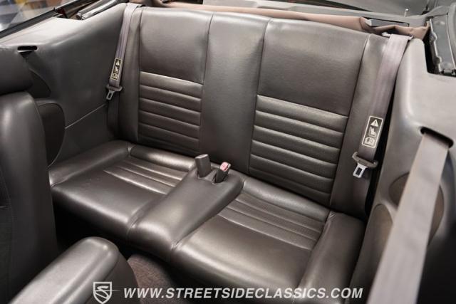 Inside, we find a well-kept stock black leather interior showing plenty of Pony emblems, power windows, power door locks, power mirrors, and power seats to allow plenty of adjustments within arm\'s reach. Unlatch the power convertible top, pump up the AM/FM stereo with a CD or cassette, and blast off into a feeling of freedom that a drop-top Mustang can provide.