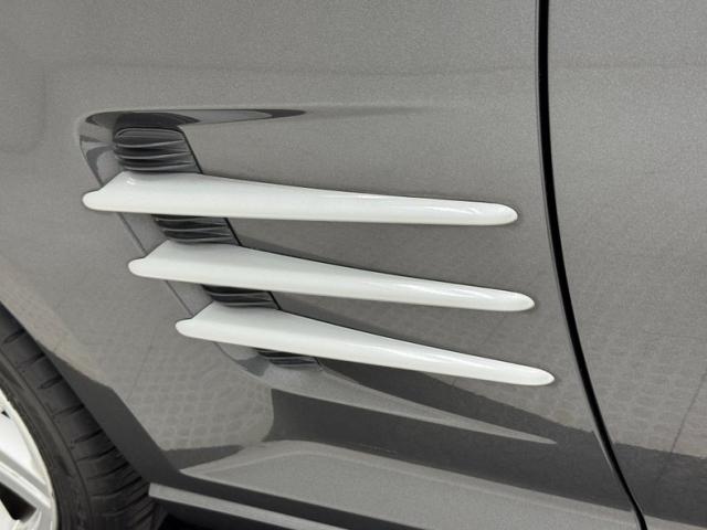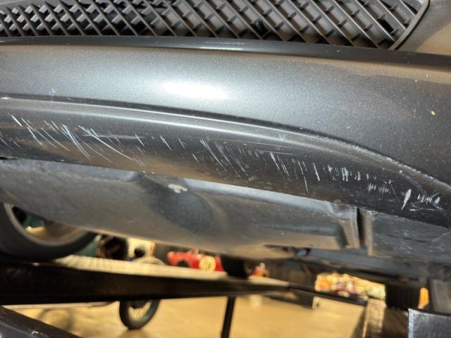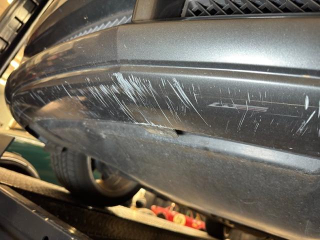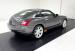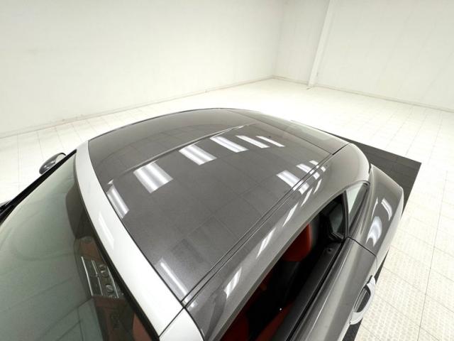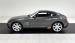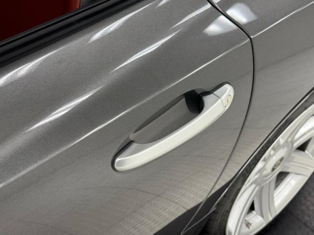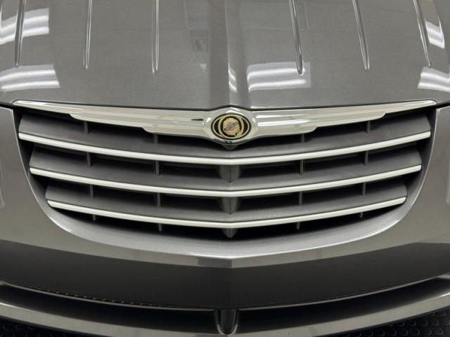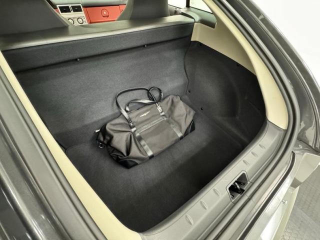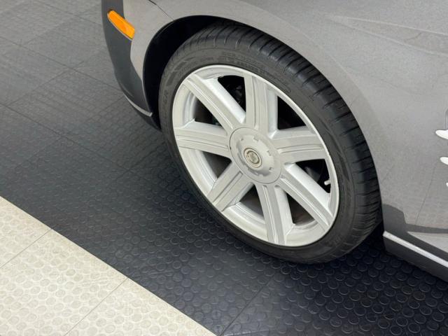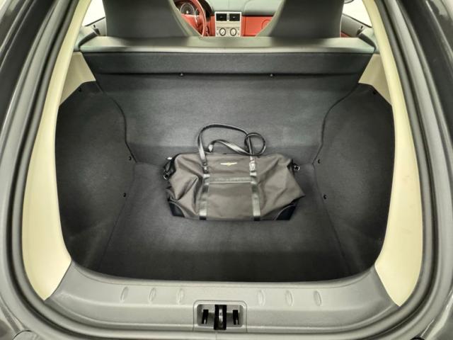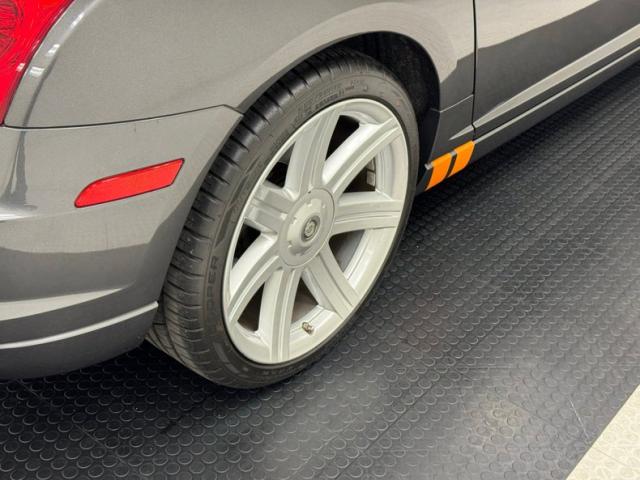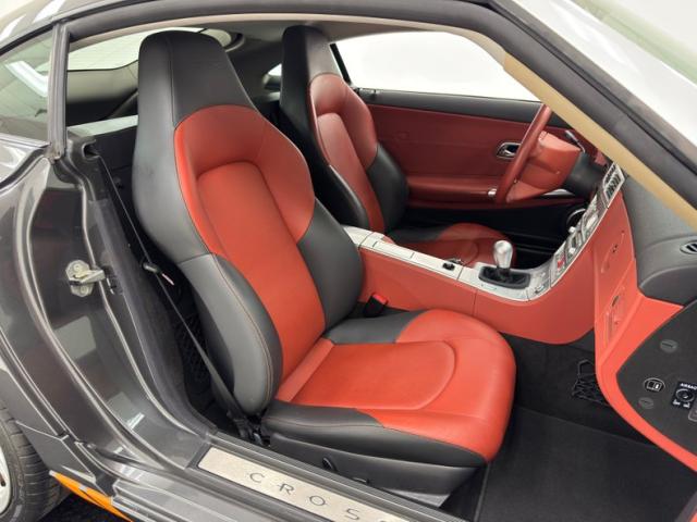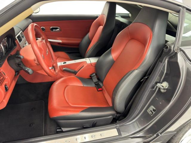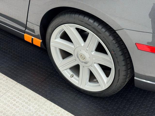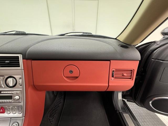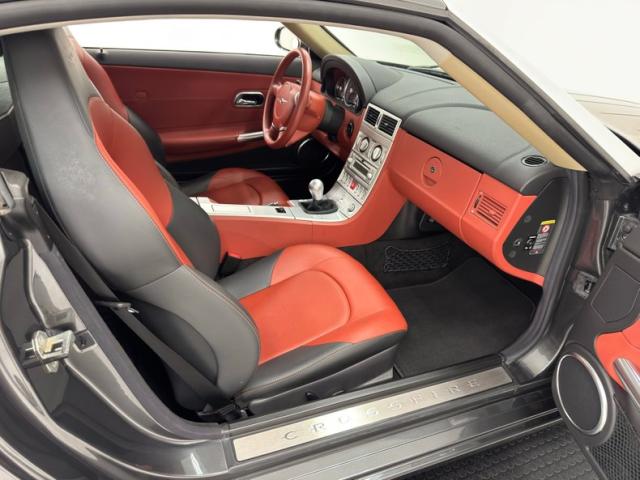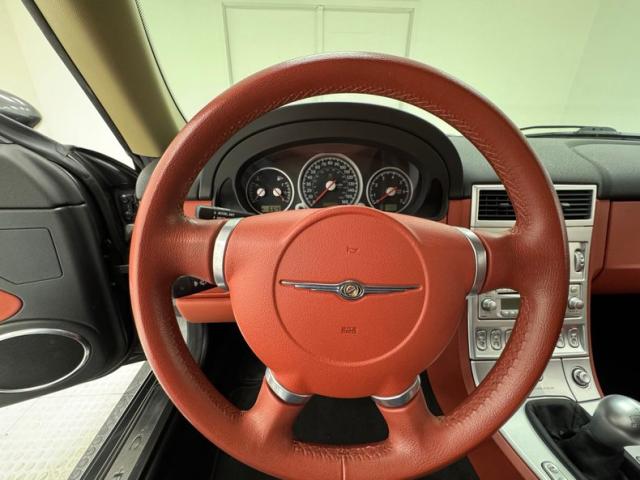 Reminiscent of the SLK, this ribbed hood long front end teardrop edged headlights car even has the side vents on the front quarters with horizontal chromed trim. Bathed in Graphite Metallic, the two stage paint is augmented by a dark rocker panel and orange stripes under the dogleg which not only looks sporty but picks up on the front side marker light. A ribbed grille sweeps back over an integrated rounded bumper that creates a smooth nose. The strakes on the side gills match the windshield frame while out back, flush tail lights hug the back of the fenders as the center flows downward extended from the sides, terminating with twin, center exit and square exhaust tips. 18-inch seven spoke wheels wear 40 series tires and fill the wheel openings with a modern profile. Imperfections are limited to chin scuffs and one spot of minor curb rash. Overall, paint and trim are excellent on the Crossfire.