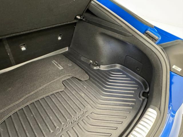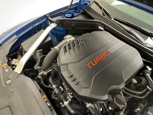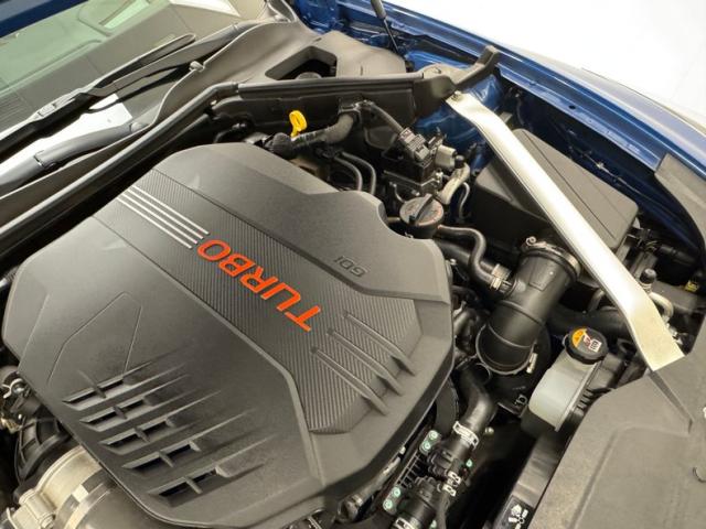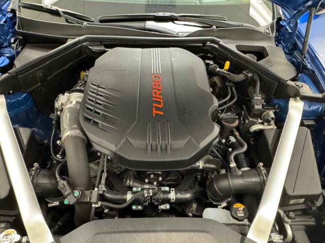 Sweeping black panels and brushed aluminum trim dress the doors, each with black plastic switchgear for the windows with extra controls for the driver. Inside, robust black leather bucket seats occupy the front with aggressive side bolstering and GT embossed in the headrest. In back, defined seating for two with a middle option and three headrests, all looking showroom fresh. A flat bottomed ergonomic steering wheel fronts the simple instrument cluster flanking a speedometer and tachometer to a central information screen. A rising screen on the center dash provides more information over turbine style vents, brushed aluminum selection buttons, and black toned A/C panel. The small shifter resides in the center console, transferring information electronically, juxtaposed by some old school cup holders to the right and more bells and whistles further back. Black carpet below, charcoal headliner above and a trunk lined with a GT branded rubber mat complete our tour of this nearly pristine Stinger specimen.