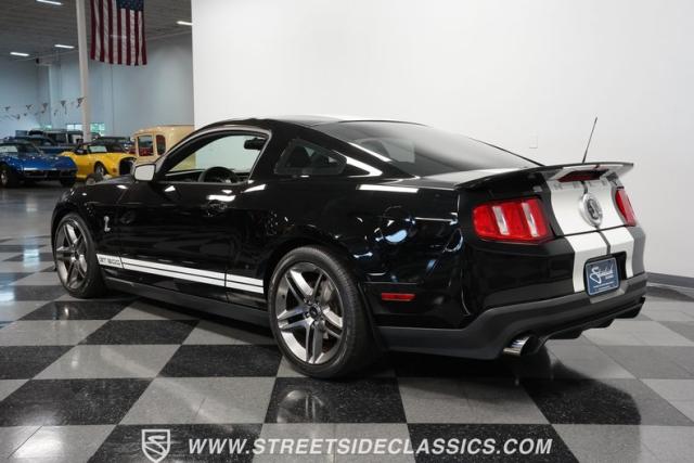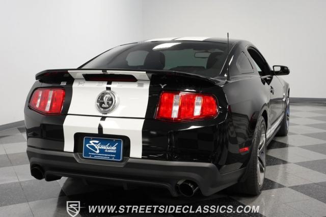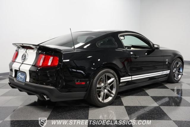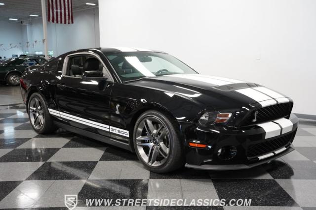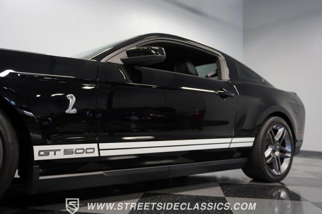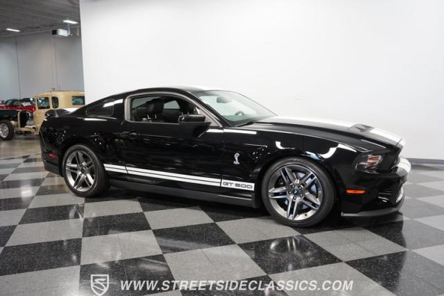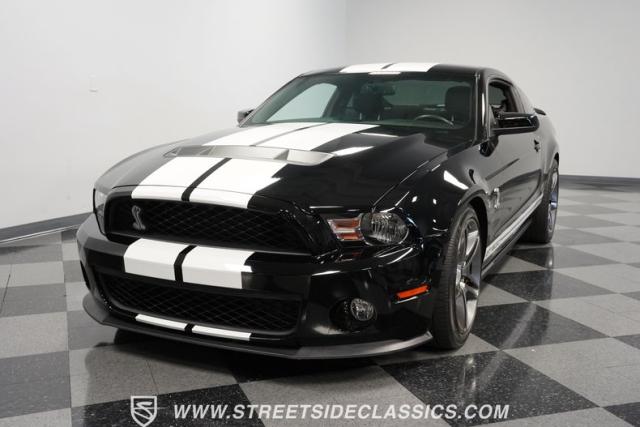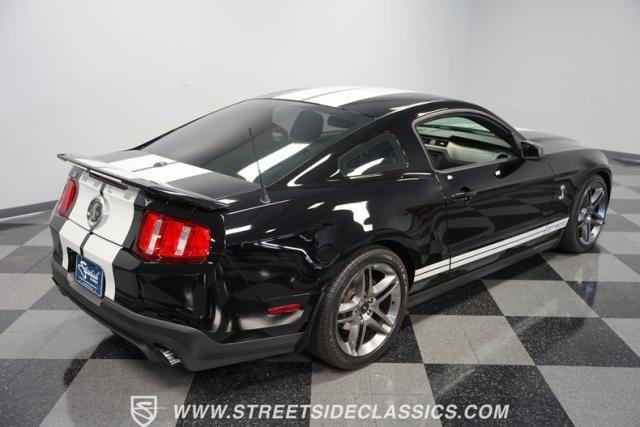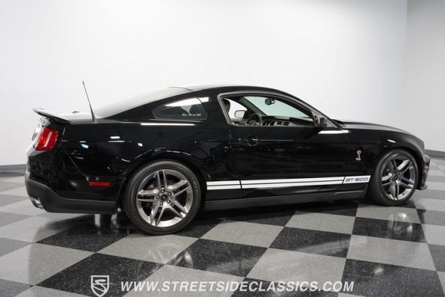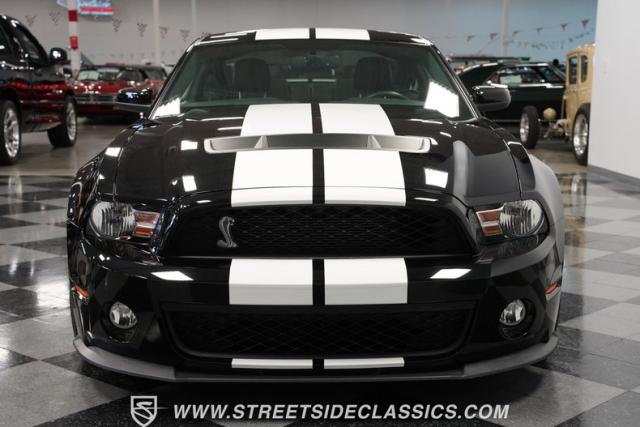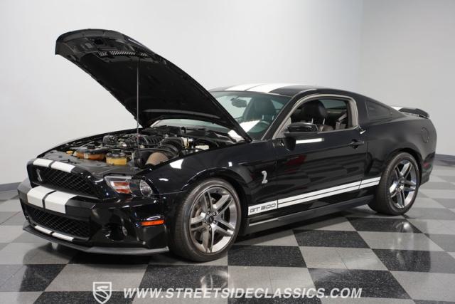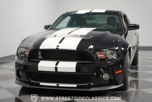 With only 12,446 miles on the odometer, this 2010 Ford Mustang Shelby GT500 in sinister black with striking white racing stripes is a low-mileage powerhouse ready to unleash its fury on the road. The aggressive coupe body, featuring the distinctive SVT GT500 front fascia, vented hood, and rear spoiler, hints at the performance potential lurking beneath. The 19-inch aluminum wheels, still wearing the original 255/40R19 front and 285/35R19 rear Goodyear tires, showcase the meticulous care this car has received. Shielded by a ceramic coating, the glossy black paint maintains a near-factory appearance, with only minimal blemishes on the lower front bumper valance.