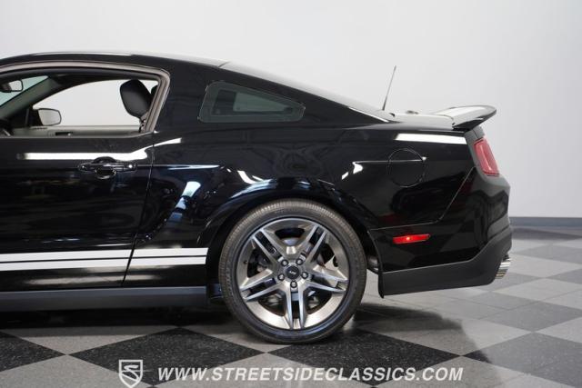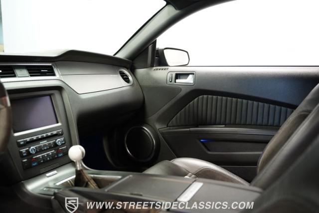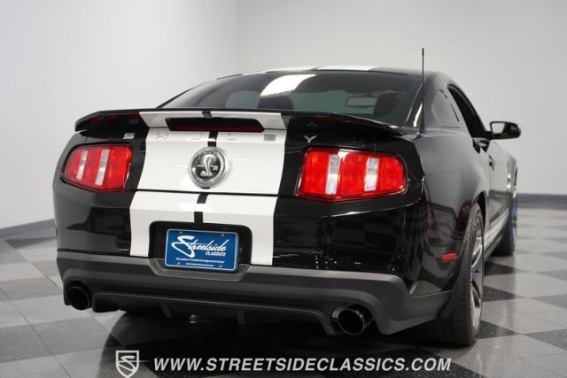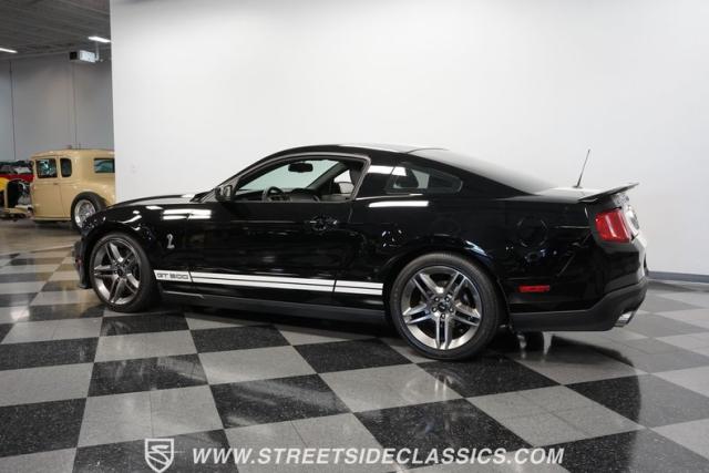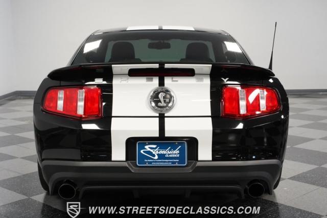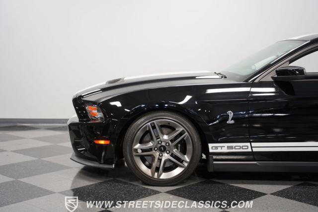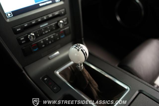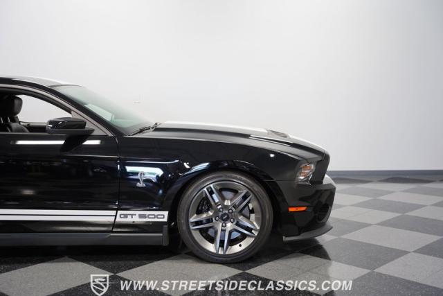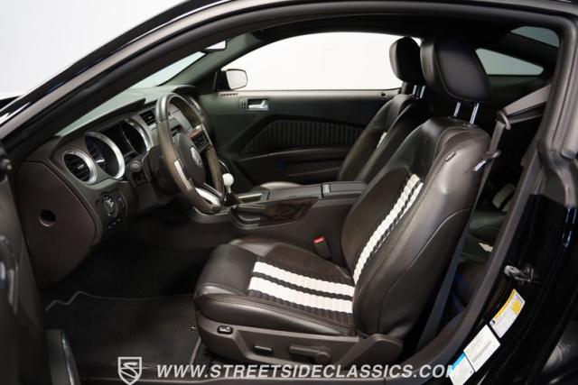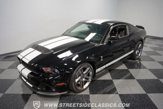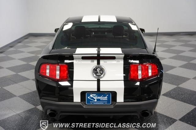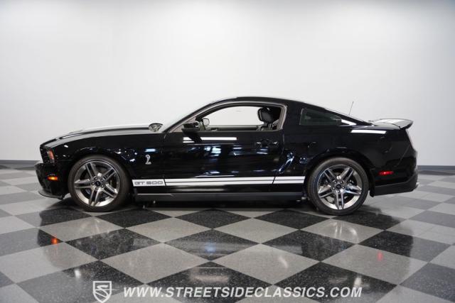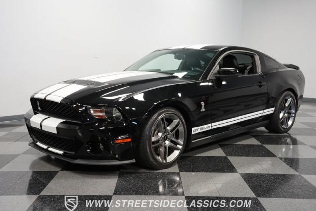 With only 12,446 miles on the odometer, this 2010 Ford Mustang Shelby GT500 in sinister black with striking white racing stripes is a low-mileage powerhouse ready to unleash its fury on the road. The aggressive coupe body, featuring the distinctive SVT GT500 front fascia, vented hood, and rear spoiler, hints at the performance potential lurking beneath. The 19-inch aluminum wheels, still wearing the original 255/40R19 front and 285/35R19 rear Goodyear tires, showcase the meticulous care this car has received. Shielded by a ceramic coating, the glossy black paint maintains a near-factory appearance, with only minimal blemishes on the lower front bumper valance.