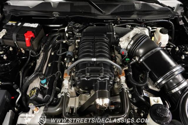 The black and white theme persists, crafting a high-contrast, performance-oriented cockpit that retains that intoxicating new car smell. The unique GT500 bucket seats, upholstered in supple leather, offer superb support during enthusiastic driving. The signature instrument cluster with SVT branding, aluminum pedals, and metal-look dash face all contribute to the car\'s exclusive character. Comfort and convenience amenities like the Shaker audio system with touchscreen, Ford MyColor ambient lighting, well-maintained upholstery, carpet, headliner, and dash pad make this interior inviting.