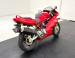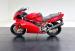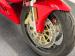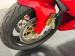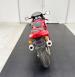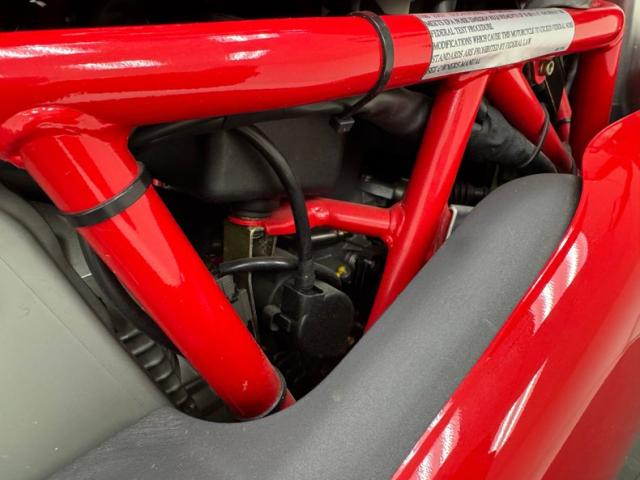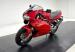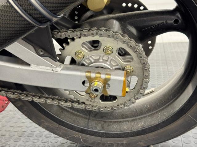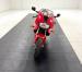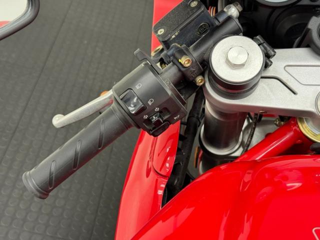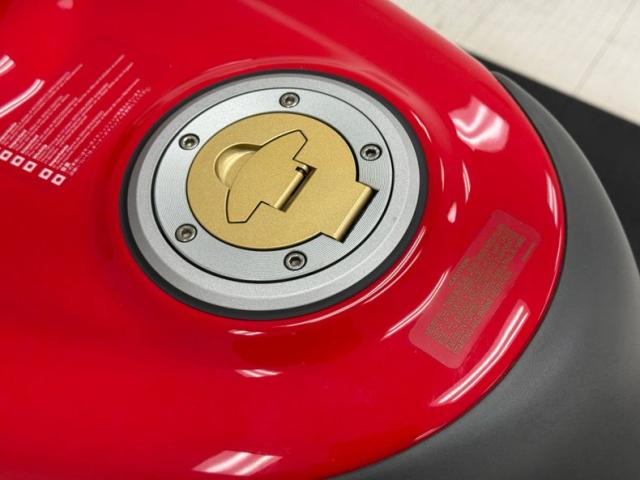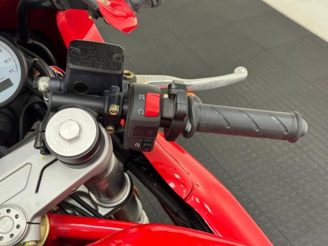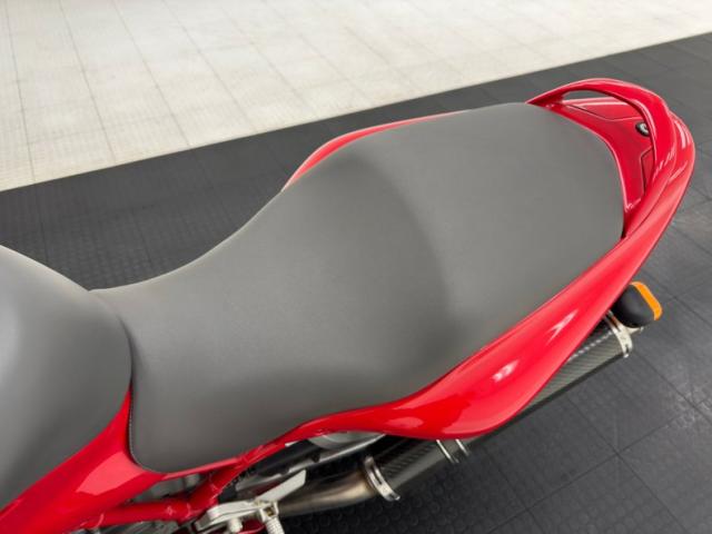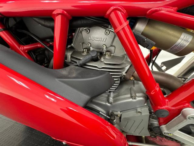 The dramatic and race inspired fairing takes center stage on this machine, bright red, and flowing rearward to cover most of the engine embedded within the tubular red frame. The curved windscreen rides the same angle as the top of the high gas tank, giving the bike a look of movement even when parked. The black vinyl seat has a matching pad on the gas tank to support the torso forward seating position and the saddle itself is based in wide, red bodywork. The only mod to the bike, the Termignoni carbon fiber mufflers, get your attention on each side and artfully follow the lines of the bodywork, pointing upward. Other than some dust on the 17-inch Brembo wheels, there\'s nothing to report in terms of imperfections on this showroom fresh Ducati.