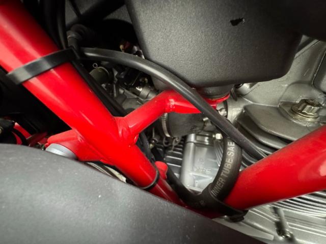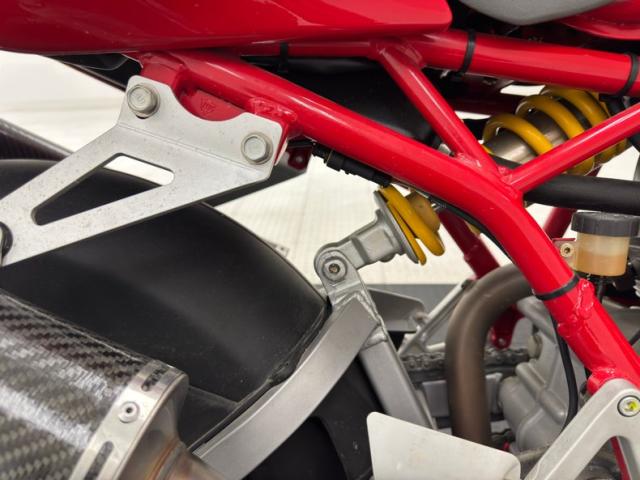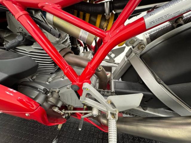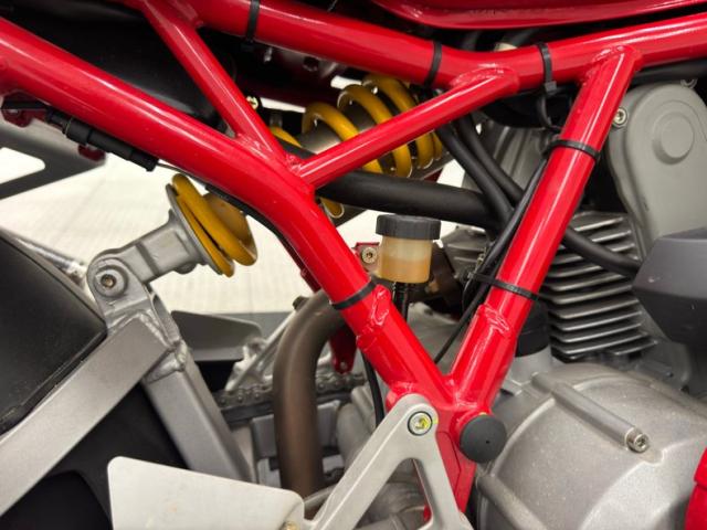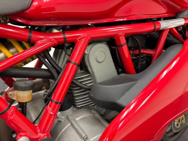 With the frame is a factory fresh 803cc V-twin producing 77 horsepower, fuel injected and tied to a 6-speed manual transmission sending power to the rear wheel via chain drive. Disc brakes are front and rear with Brembos employed in the front. Suspension consists of an inverted Marzocchi fork in front and a Sage Boge adjustable shock mounted behind the engine and presented in showy yellow paint.
