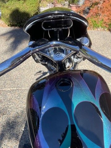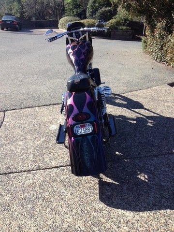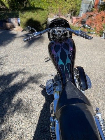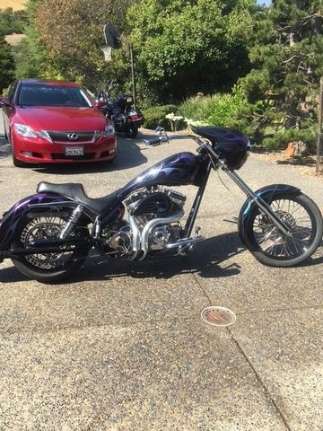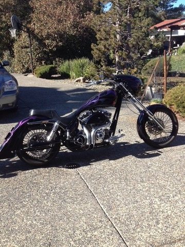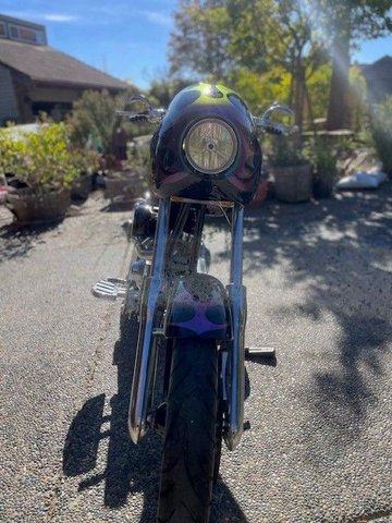 This 2003 Arlen Ness Custom FXR is all show and go in beautiful black paint with chameleon flames. 103 Harley crate motor, balanced and blue printed, 609 cam, roller valve train, 51 MM CV carb, Baker 6 speed, right side belt drive, custom 40 spoke fat spoke wheels, 40 degree rake, 5 inch stretch. This bike has it all and was built by the best. Offered at $34,995 OBO.