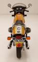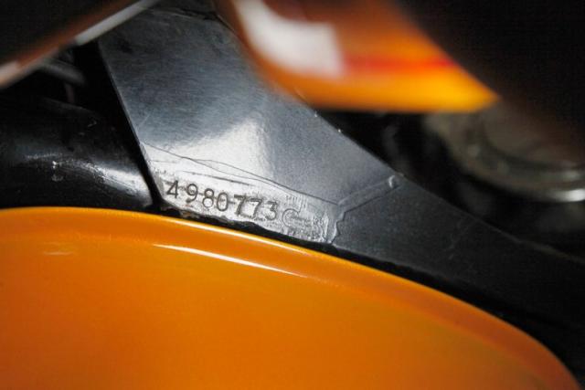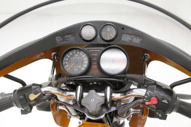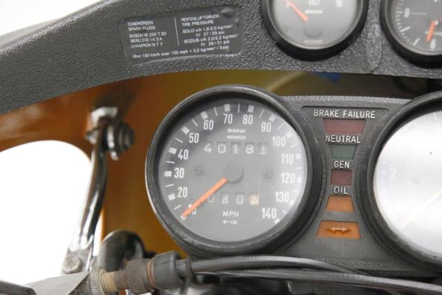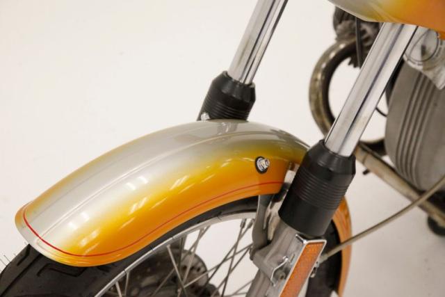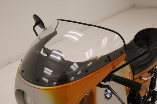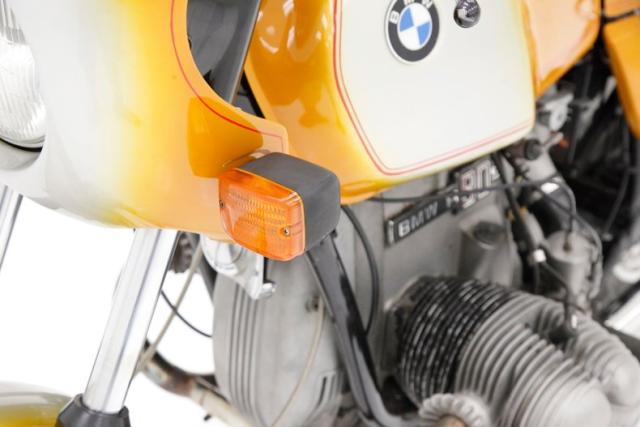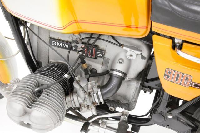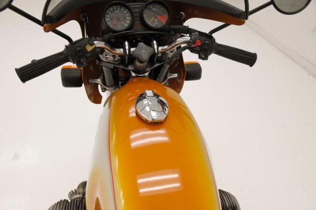 Starting off we spot the most noticeable design inthe S\'s bikini fairing and the rounded, aerodynamic tailpiece behind the seat that featured a BMW roundel logo. Speaking of the seat, it has the extended package handlebar should you decide to pick up some evening refreshments on your ride. For this 1975 model year, an even more spectacular two-tone treatment is draping the body in Daytona Orange, which includes a sunburst pattern on the tank and red pin striping all around. This paint and striping is all done to factory spec and presents with nary a flaw or fault. We also note a new windshield and mirrors as well. The finish was the sort of \"look at me\" design that marked an even bigger step outside of BMW\'s regular territory. Beyond the paint job, the bodywork-from the small fairing to the cowl-like piece behind the seat-was admired and copied throughout the industry in the coming years by everyone from Suzuki to Harley-Davidson.