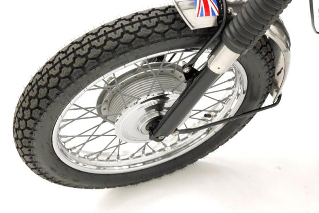 Telescoping forks traverse a 19-inch wire spoked wheel wrapping a 3.25x9 rubber tire and a front drum brake. The forks end in the handlebars which reach for the rider and this is a feature known for the Triumph ride. All controls are working and within reach. As the rider looks down upon the circular sweep speedo they can see the large chrome bezel headlight in front of said speedo. Also, a bit lower is a chromed front fender. Moving our eyes downward, we can gaze upon the dual purple painted tank in a curvaceous structure and the chromed fuel filler cap. It sports the Triumph badge and looks great on all surfaces. A vented black leather punched seat with smooth bolsters has room enough for two, but the bike is known for riding better with one. Just below another chromed fender, and a swing arm with Girling shock absorbers and another drum brake within a wheel in wire showing as 18-inch form and nice deep tread rubber wrapping it in 4.00x18 size. Dual chrome exhaust are on each side and these have chromed seamless mufflers in the pipes. Cracking toast Grommit!