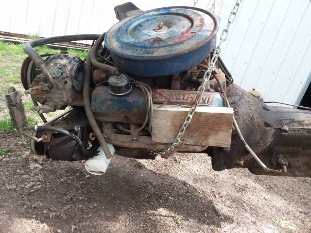 1972 Ford 360 complete motor with trans. Running when pulled. Trans good. Heads and valves done-lower end needs rebuild. Stored in barn. Nothing missing. JD.