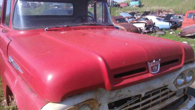 selling 60 ford truck hood.fits 57-60 but has different style.it does not have the normal dent in center,lite rust scale.decent hood for its age.plus shipping.we also have 1500-2000 cars and trucks from the 30\'s-70\'s for parts or whole.located southern mn by albert lea.good luck.507-383-1802 steve.truck has 6 17.5 duallie wheels also.many other parts and trucks.