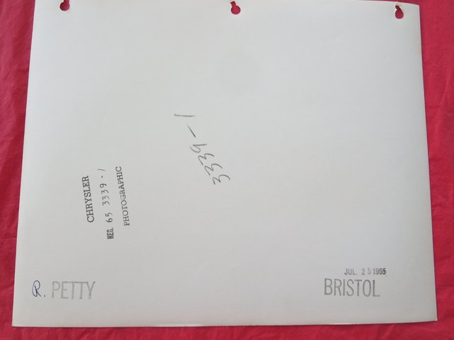 Vintage 8 x 10 Black and White picture that shows Richard Petty looking at damage to his car. This picture was taken by Chrysler Photographic on July 25,1965 at Bristol and is stamped on the back with the negative number. It is in good condition but has three punched holes as it was in a binder. -- $35.00 -- Call 440 382-8161