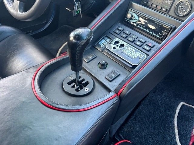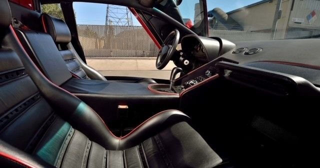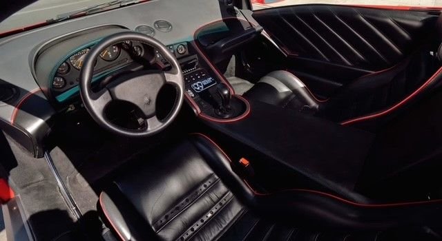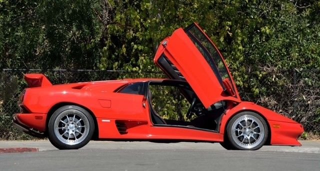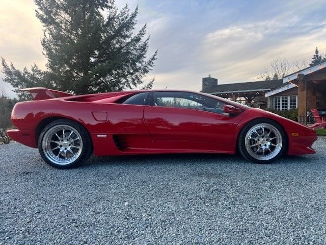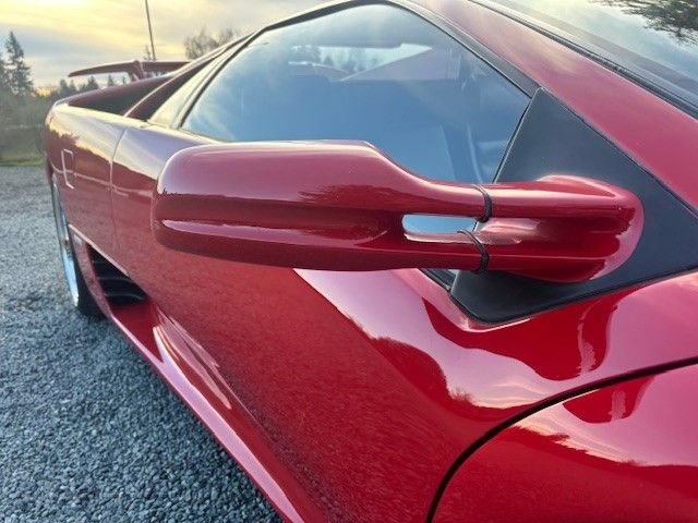 The car has a red exterior with black interior with red piping. 27,934 miles, metric odometer shows 44,955 kilometers. Scissor doors, rear wing, quad exhaust tips, Brembo 4 wheel disc brakes with black calipers, and polished alloy wheels. All wheel drive, 5.7L V12 engine, with 5 speed manual transmission to feel the pedal to the metal. New clutch assembly, new rear main engine seal, new air conditioning system, new oil filters, fresh coolant flush, gated shifter, tachometer, clock, power windows, and Alpine AM/FM/CD to roll with your favorite tunes.