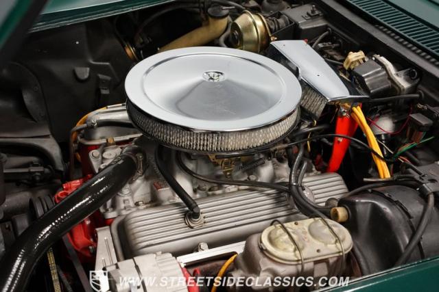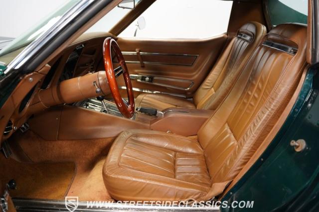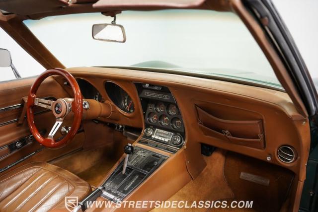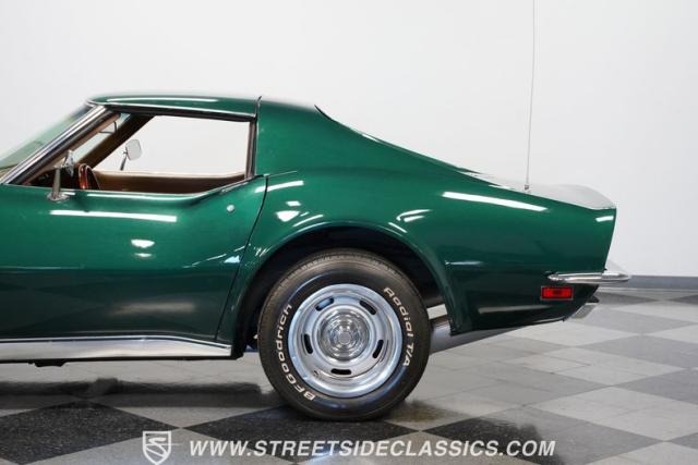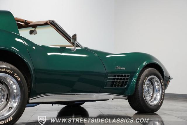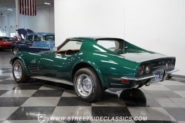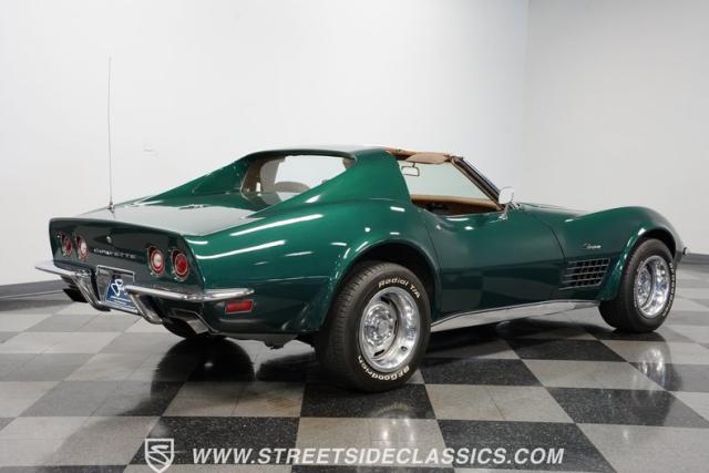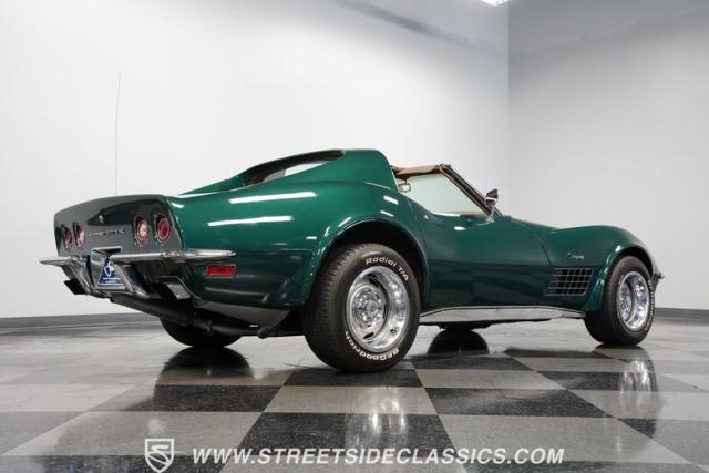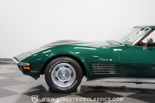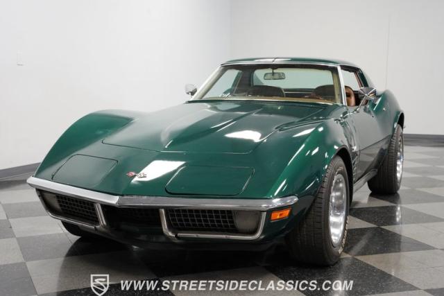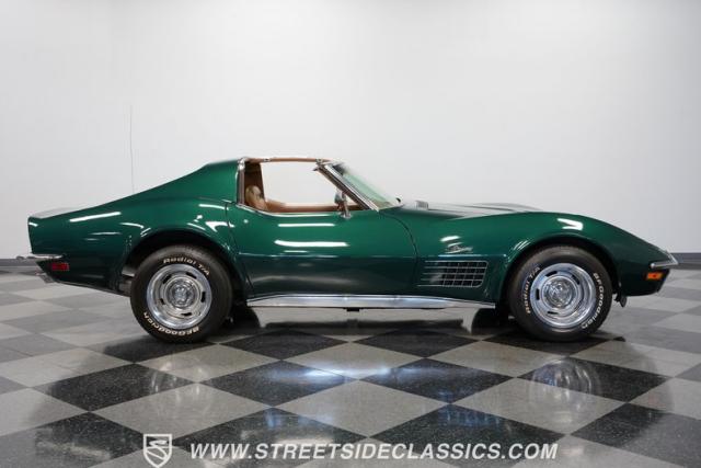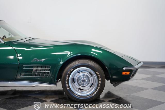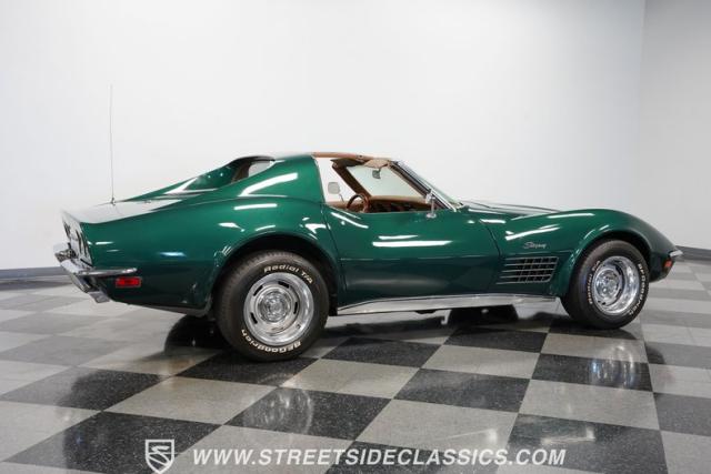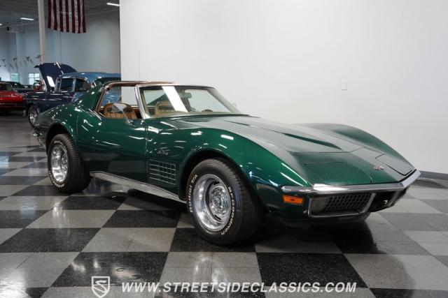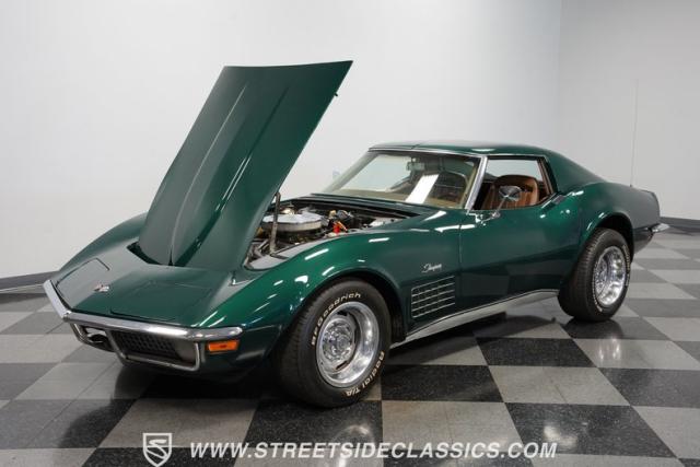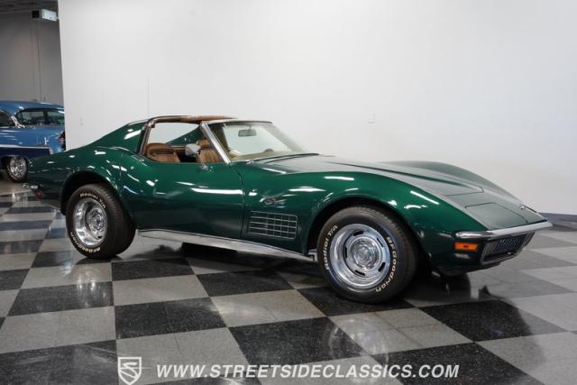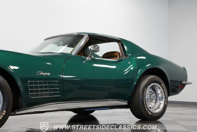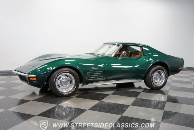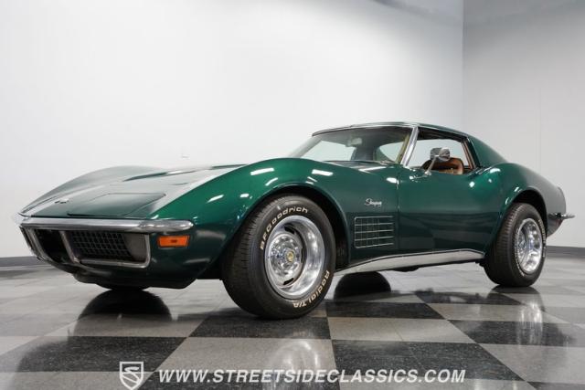 This 1971 Chevrolet Corvette flaunts a Brands Hatch Green exterior that\'ll stop traffic. The sleek, aerodynamic body of this C3 Corvette exemplifies American muscle design. T-tops (with available storage bags) offer the flexibility to enjoy open-air cruising or enclosed comfort. The aggressive stance is accentuated by 15-inch wheels wrapped in beefy 235/60R15 tires on all four corners. Dual exhausts emerge from the rear, signaling the V8\'s power. A fiberglass hood with a faux air scoop adds a performance-inspired touch, while the full repaint gives this classic \'Vette a fresh, vibrant look that\'ll make it the star of any car meet.