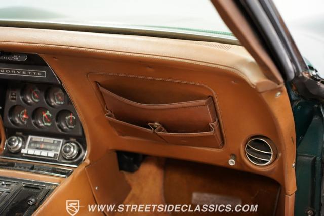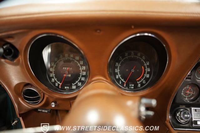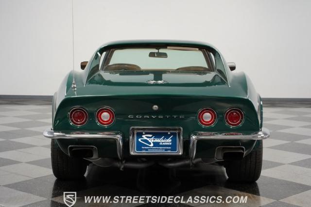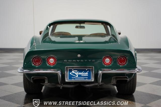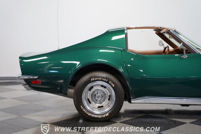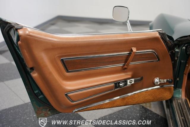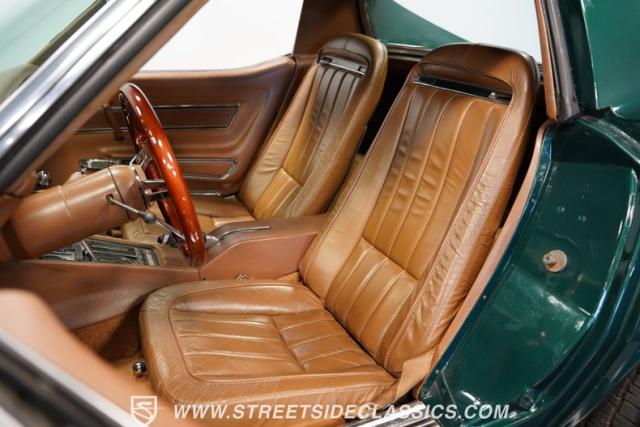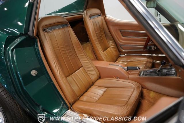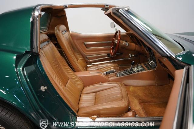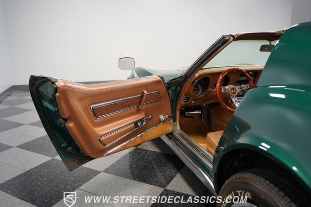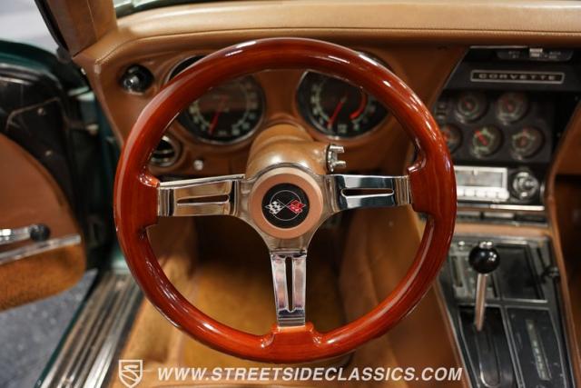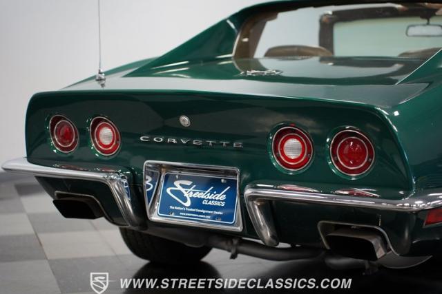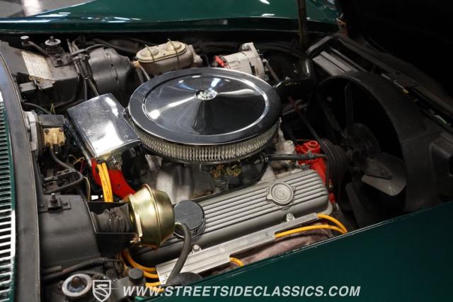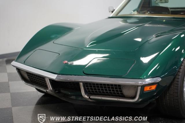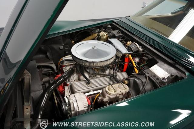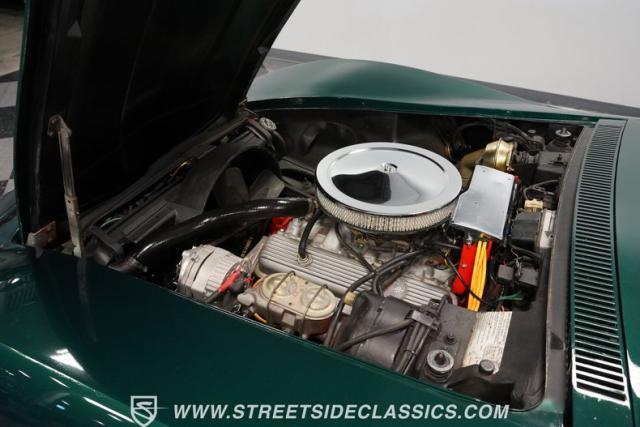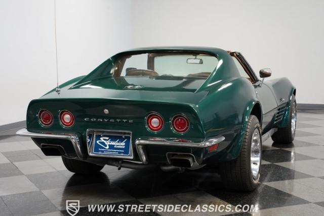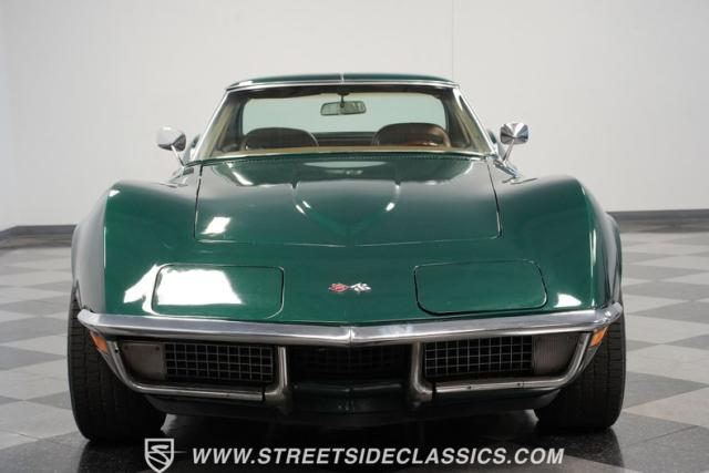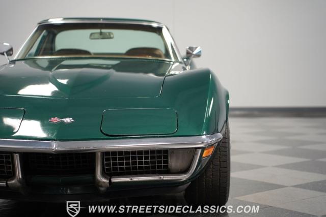 This 1971 Chevrolet Corvette flaunts a Brands Hatch Green exterior that\'ll stop traffic. The sleek, aerodynamic body of this C3 Corvette exemplifies American muscle design. T-tops (with available storage bags) offer the flexibility to enjoy open-air cruising or enclosed comfort. The aggressive stance is accentuated by 15-inch wheels wrapped in beefy 235/60R15 tires on all four corners. Dual exhausts emerge from the rear, signaling the V8\'s power. A fiberglass hood with a faux air scoop adds a performance-inspired touch, while the full repaint gives this classic \'Vette a fresh, vibrant look that\'ll make it the star of any car meet.