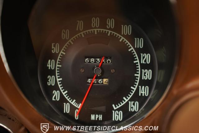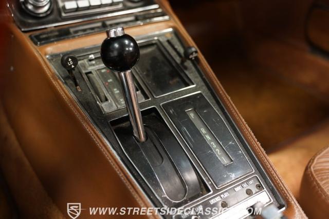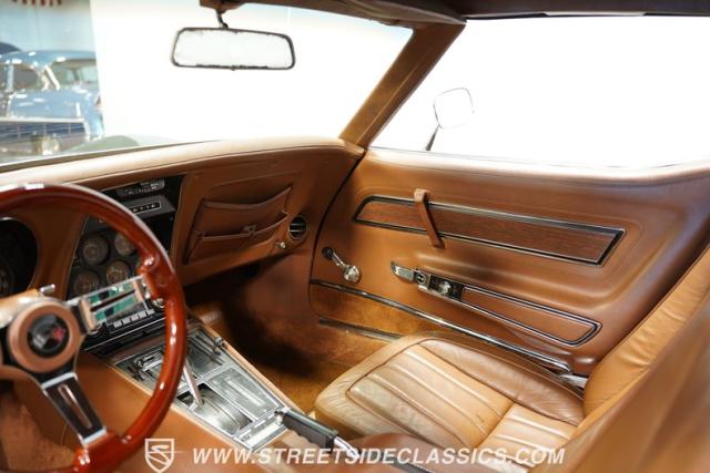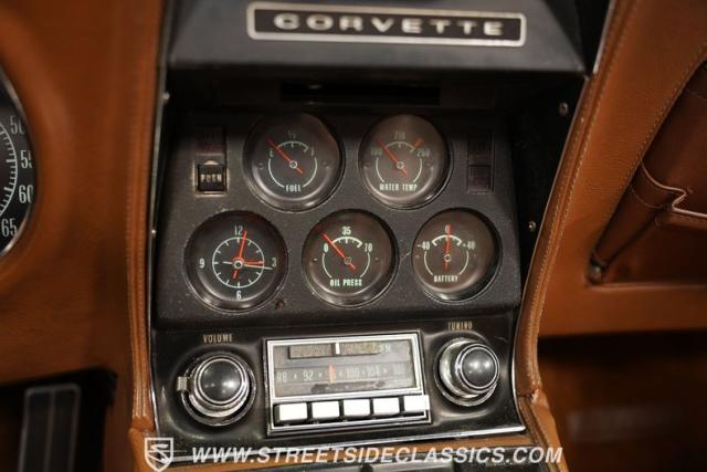 Inside, the Saddle-colored interior delivers 1970s style. Vinyl bucket seats provide comfort with a period-correct look. An aftermarket steering wheel controls you while the floor-mounted shifter waits for action. The original AM/FM radio will pump out your favorite tracks. All essential gauges are housed in the dash, keeping you informed as you put this Corvette through its paces.
