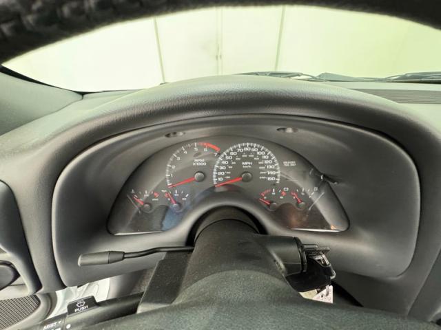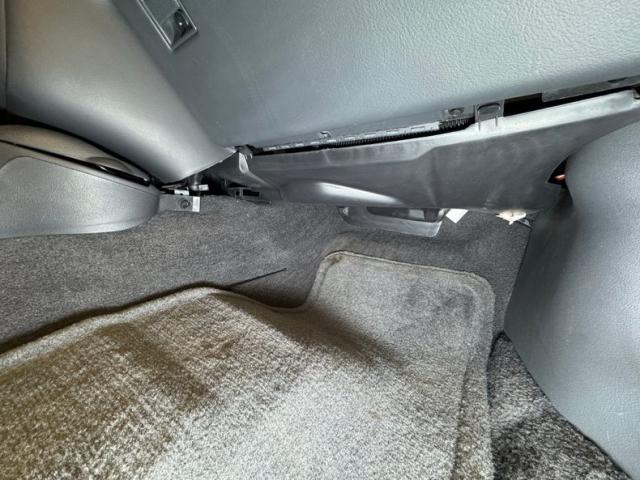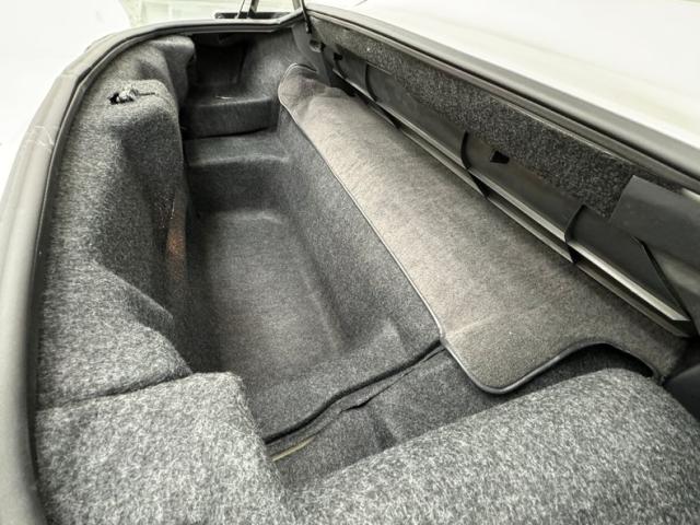With the drop top dropped we have a clear view of the passenger compartment and its showroom condition. Dark gray leather covered high back buckets are in front and a 2 plus 2 split bucket seat bench stretches across the back. Racing between the seats is a black undulating center console which has a storage area and houses the gear shift lever. As the center of the dash rises, it has temp knobs and controls, a blue readout digital AM/FM/CD stereo and a toggle for the power activated top. A deep inset instrument cluster with a padded overhang on top shows very clean and has a litany of analog white letter and number gauges with red pointers. Nice gray carpeting floods the floors, and like new matching gray carpeted floor mats protect the carpeting below.