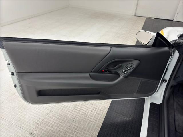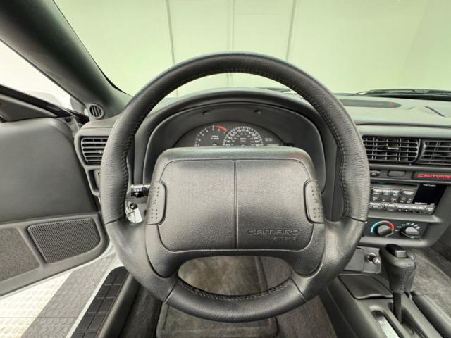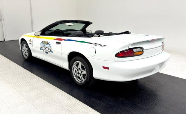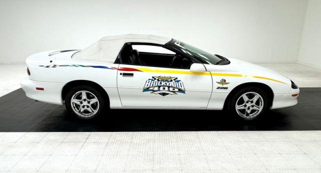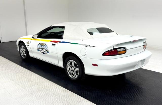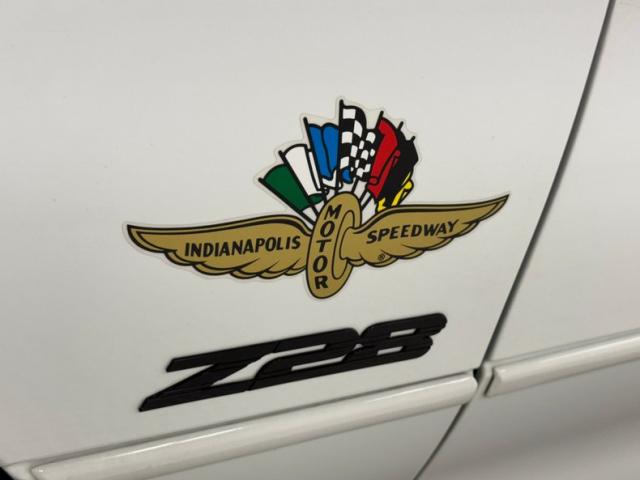 Donned all in Arctic White and not a mark on it we see a stock Z28 coded Camaro shape with inset horizontal headlights deeply inset between the hood and neoprene bumper. Within this bumper is a small black egg crate grille and some signal lights that wrap around to the front quarter. On the sides we note the graphics and above the front quarter badge location is the Z28 designation, and an Indianapolis winged tire logo. Our consignment is adorned with a matching white convertible top, and C A M A R O badge in white across the top of the raked rearward windshield. When it\'s down it has a gray plastic molded to the car tonneau covering which matches the interior. On top of the rear trunk deck is an aero looking spoiler which is the above framing for the sleek tail lighting below. Another body matching neoprene rear bumper is below, and it is pristine with no errors noted even upon close inspection. 16-inch polished wheels with 5 spokes in a star pattern are on all 4 corners of this low, low mileage beauty.